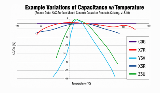 Los cambios de temperatura pueden cambiar notablemente la capacitancia, especialmente en X5R e Y5V.En condiciones extremas, esto puede afectar la sincronización, el filtrado y el comportamiento general del circuito.