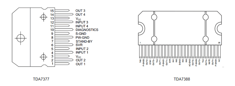 Las funciones PIN se refieren a las diferentes funciones de la interfaz del chip, como disipador de calor, conexión a tierra, encendido y apagado, silencio, detección de temperatura y otras funciones.Los siguientes son los nombres y funciones de PIN de TDA7377 y TDA7388 respectivamente.